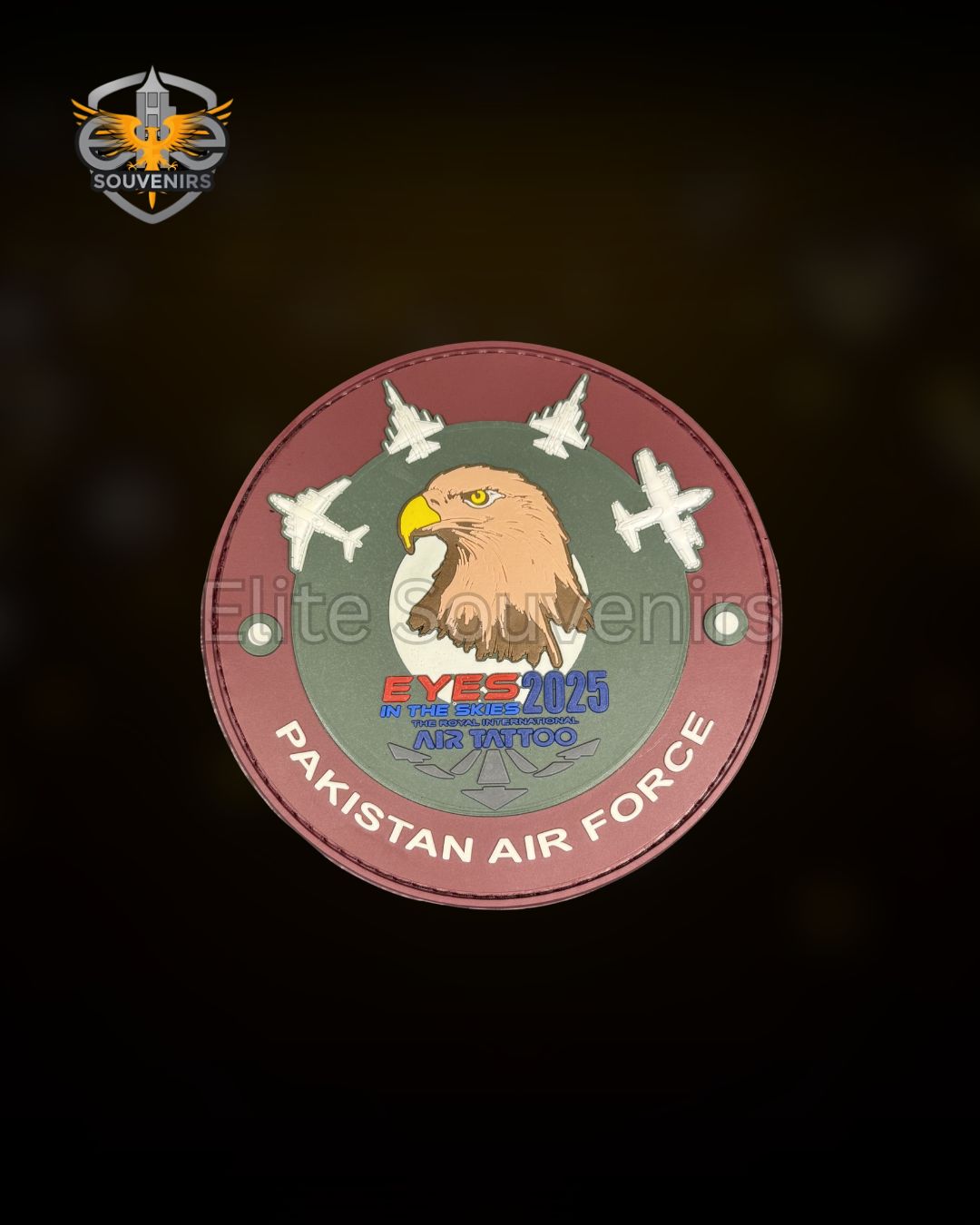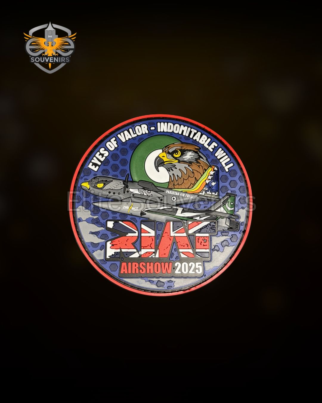 This collection includes custom-designed souvenir coins and badges featuring Pakistan Air Force (PAF) themes. The items display insignias from specific squadrons, national symbols, and international aviation events like the RIAT Airshow.